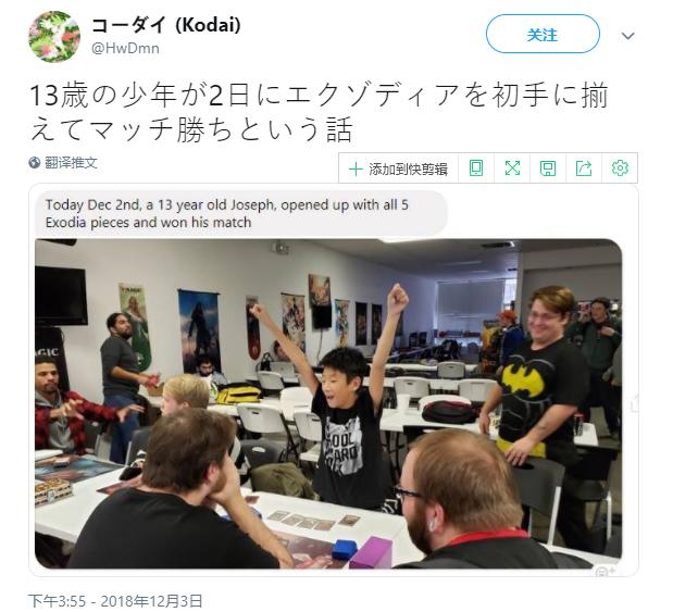 一名推特网友发文称,在去年12月2日的一场比赛中,13岁的少年Joseph起手就拿到了5张“艾克佐迪亚”,也就是大家俗称的“黑暗大法师”。根据游戏王规则,5张黑暗大法师组合在一起会有“自动获得胜利”的特殊能力,于是这位少年开局就直接赢得了这场比赛!