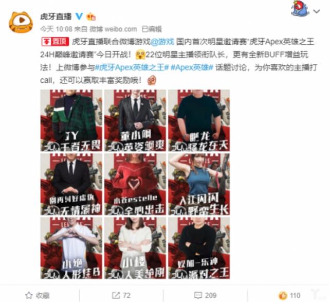虽说《Apex 英雄》在国内受到热捧,社交媒体口碑传播也是功不可没,甚至一度上了微博热搜,吸引了不少粉丝。因此本次“Apex英雄之王24H巅峰邀请赛”不局限于虎牙直播平台,联合@微博游戏 作为官方战略合作社交媒体,为本次赛事在社交媒体进行传播覆盖,并带来全新BUFF增益玩法。
