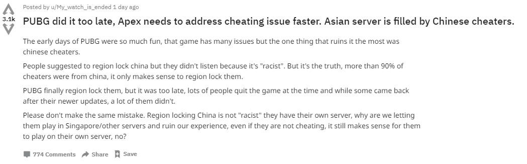 Reddit论坛这位玩家拿出绝地求生做例子,认为绝地求生早期非常有意思,但中国作弊玩家非常让人失望,一些玩家向官方建议锁区,被官方以“种族歧视”打回。后来作弊的中国玩家越来越多,大约有90%都是,PUBG也不得以开启了ping值限制,不过为时以晚,很多人都退出了这款游戏,绝地求生人气大幅度下跌。