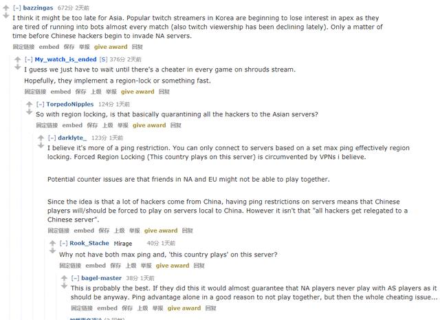 目前该帖子已经引起大量玩家进行讨论,很多老外认为因为中国作弊玩家的一些行为,已经在亚服大肆破坏了,韩服一些主播因为外挂问题都失去了对APEX英雄的兴趣,而且美服也开始遭到了一些中国作弊玩家的入侵。