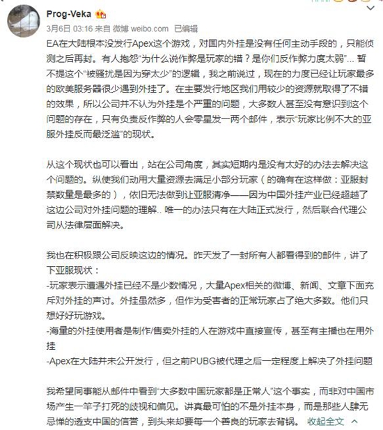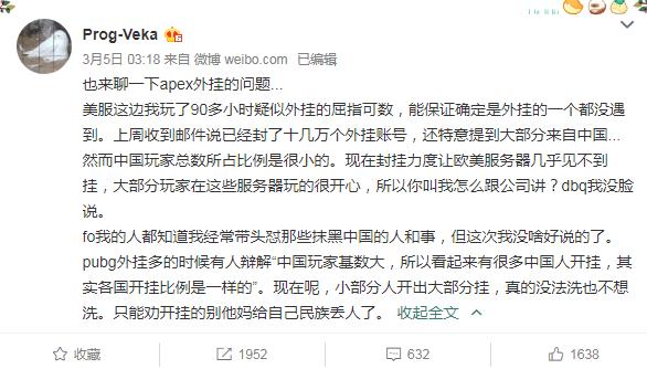 “现在APEX英雄不能再犯同样的错误,封锁中国区不是“种族歧视”,他们有自己的服务器,为什么让他们跑到其他服务器上玩,破坏自己的游戏体验?而且让他们在自己服务器上玩也是非常合理的”