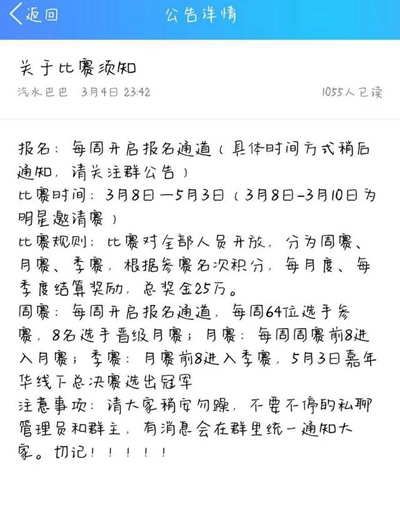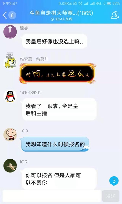 这样的行为让群内的玩家彻底炸锅了,说好的海选比赛,结果有段位要求,达到要求报名了,却连比赛都没比,直接就决定名单了,而且大部分还是主播,这样的行为让玩家们忍无可忍!很多玩家在群内开始激烈的套路了,有玩家表示别再宣传什么海选报名了,还有玩家表示自己皇后也没选上。