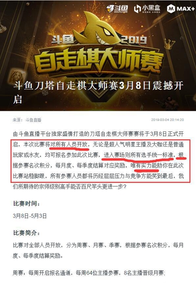 结果,几天之后周赛的名单公布时,终于是引起了玩家的强烈不满。因为海选赛报名的玩家,一局比赛都没打,而名单却已经决定了,并且这份名单还让人非常眼熟,其中大部分都是斗鱼平台旗下的主播,少数几个玩家的ID也让人非常眼熟。