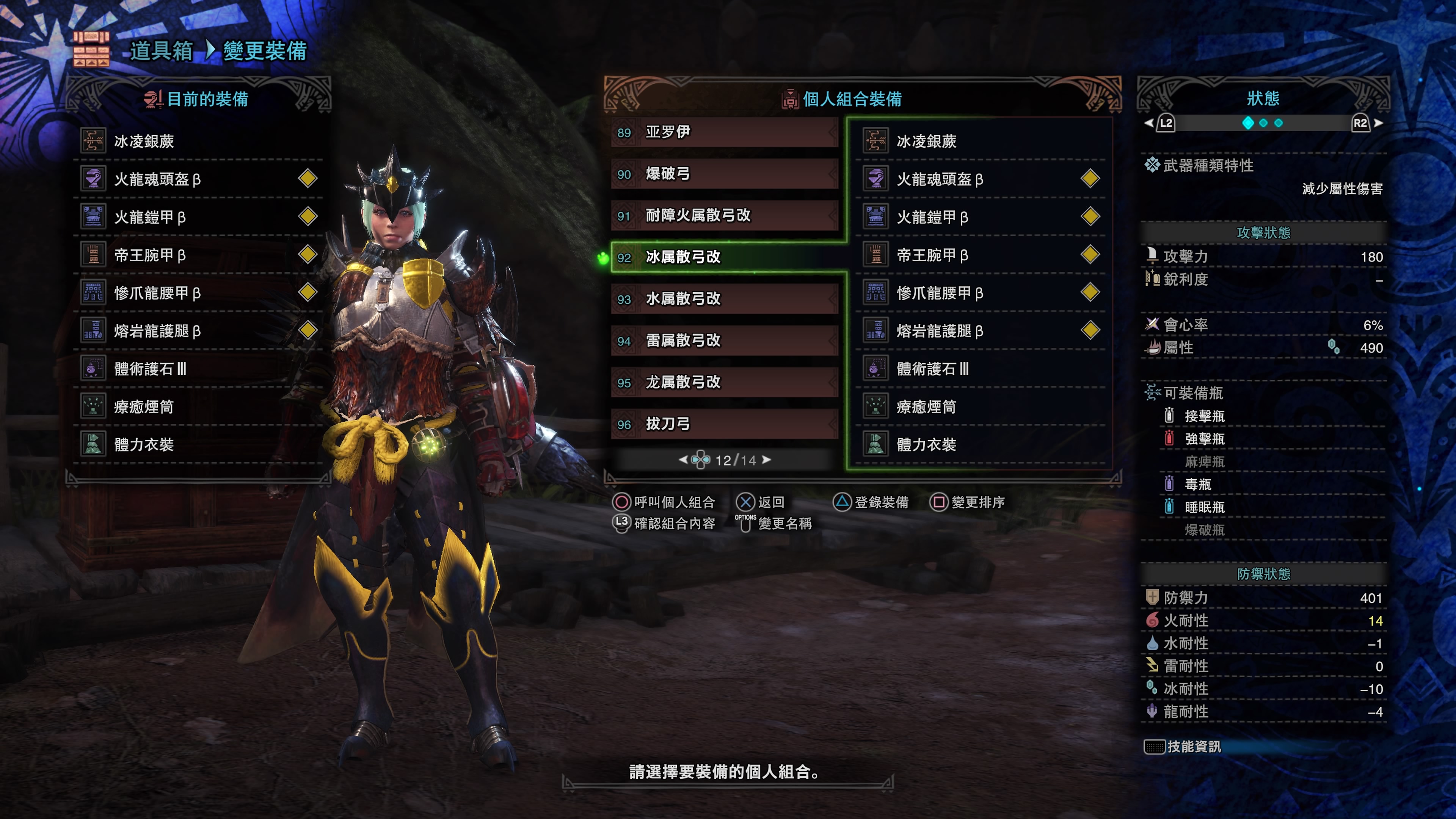 由于这把弓没有镶嵌槽,所以散弹强化用熔岩腿来实现比较好,属性值上限是510,多一颗冰珠也只能加20点了,所以三颗就够了