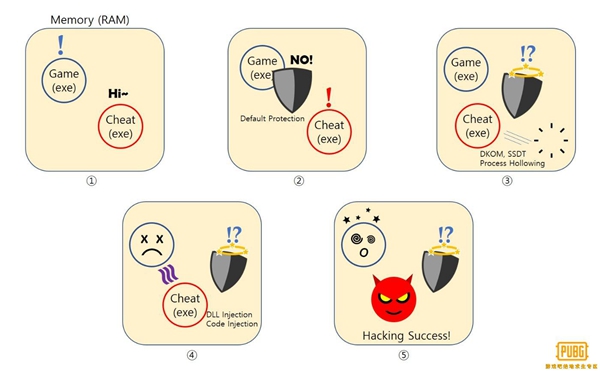 《绝地求生》遭受着各种类型的作弊程序的攻击。我们通过采取多种安全措施来应对各种类型的攻击以提高效率。我们首先将阐述作弊软件通常的运行原理以及我们技术强化所基于的原理。