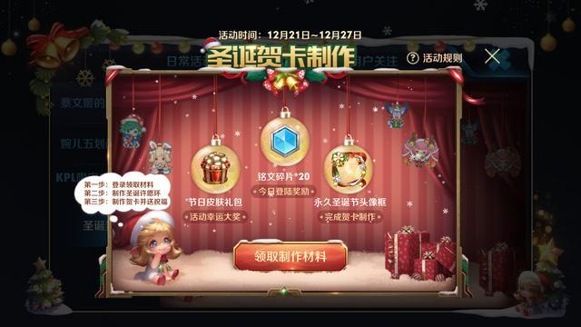 在活动面板上的限时活动中,每日登录领取材料和皮肤抽奖礼包,然后将四种不同类型的材料合成许愿环,再选择祝福语制作成贺卡,最后将贺卡发送给好友,就能领取圣诞专属头像框了,最快也需要两天才能完成。