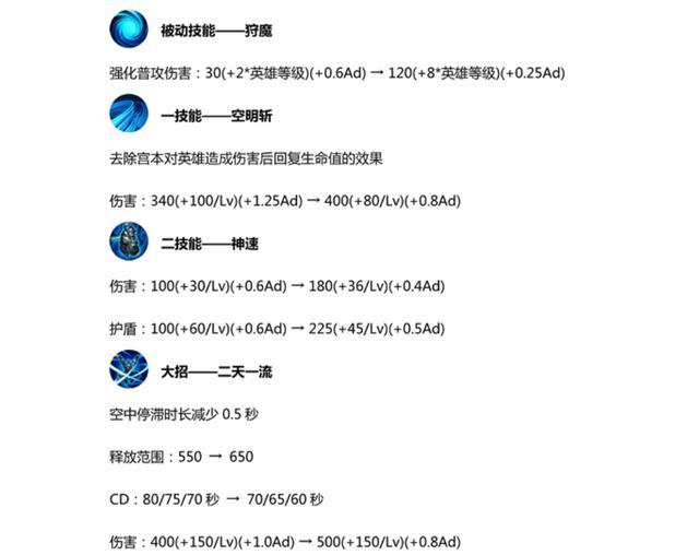 所有技能的前期伤害增高,后期伤害降低。1技能回复效果移除,大招CD减少,释放更快,范围更广。