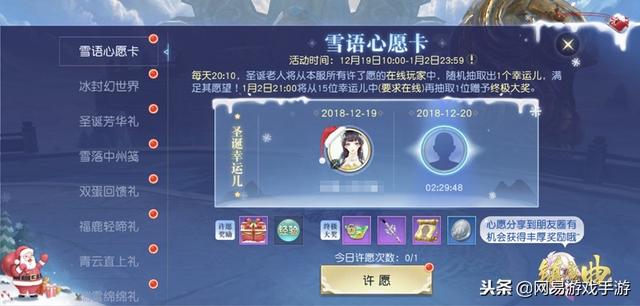 圣诞老人是个美丽的童话,但《镇魔曲》能满足你的愿望!“雪语心愿卡”活动中,每位天命者都可以许下自己的愿望,每天1位幸运儿送上包括珍稀材料、神兽材料等奖励在内的“圣诞喜礼”,还有绑定元宝、周边银饰等终极大奖呈上,看看谁是新年最强“锦鲤”!