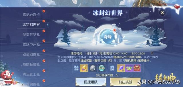 然而,总有妖魔不愿人间祥和。如那出现之际便会冰封千里的“冰封之魔”,便趁着圣诞节出来搞事情!每天12点至14点、18点至22点两个时间段里,天命者们都可以前往挑战、阻止它为祸人间的阴谋,成功即有幻彩虹光等奖励送上,还能收集“奇缘卡”、赢取绑定元宝、圣诞喜礼等额外奖励!