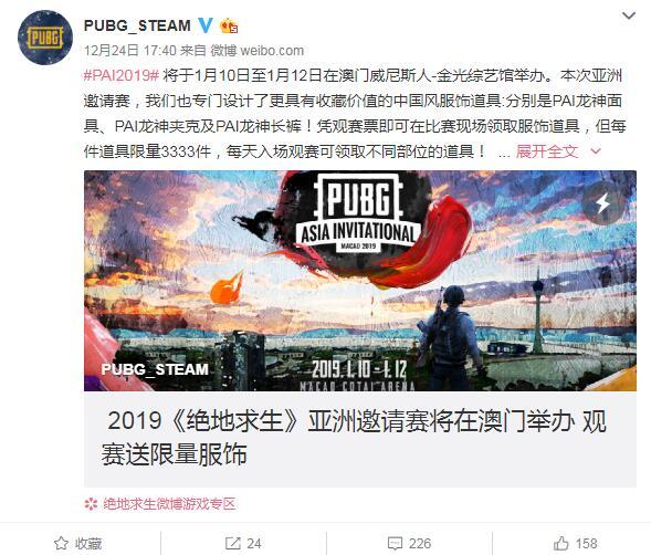 绝地求生》亚洲邀请赛(简称PAI)将于1月10日至1月12日在澳门威尼斯人-金光综艺馆举办。本次亚洲邀请赛,官方也专门设计了更具有收藏价值的中国风服饰道具:分别是PAI龙神面具、PAI龙神夹克及PAI龙神长裤!凭观赛票即可在比赛现场领取服饰道具,但每件道具限量3333件,每天入场观赛可领取不同部位的道具!
