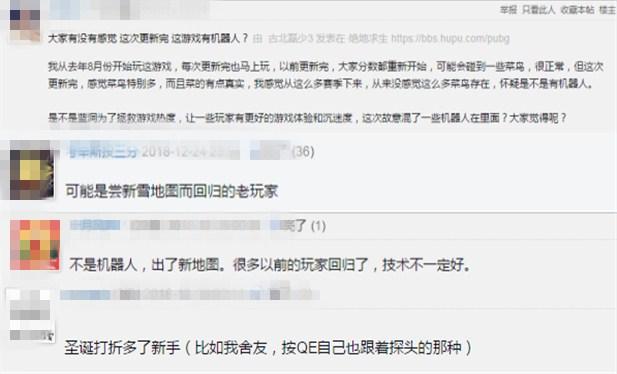 不过近日有网友表示,绝地求生是不是暗改加入了机器人?这位网友表示,新版本更新后,感觉菜鸟太多了,因此怀疑是不是官方暗中加入了机器人。对此,其他网友一致表示,不是加入了机器人,而且因为雪地图的上线,很多老玩家和新玩家加入,因此才会出现那种十米之内被打了却不知道敌人在哪儿的玩家,机器人是不存在的!