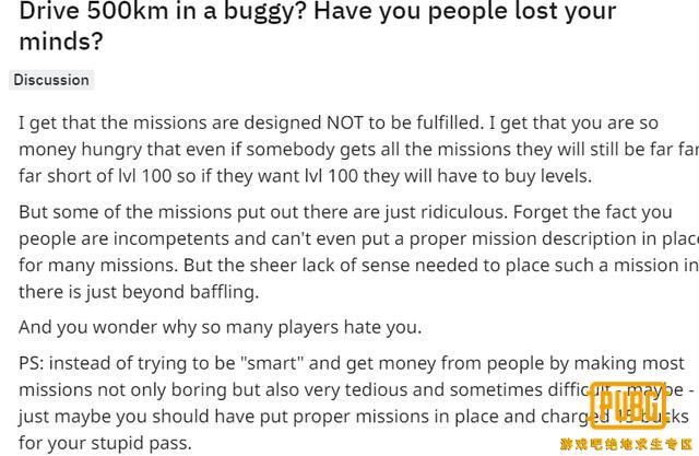 绝地求生雪地通行证第二周任务在今天解锁,其中有一个任务是绝地求生驾驶双人越野车500KM,有玩家表示就是一局内什么都不做,落地就开车也要7个半小时才能做完,而种种奇葩任务导致玩家疯狂吐槽。